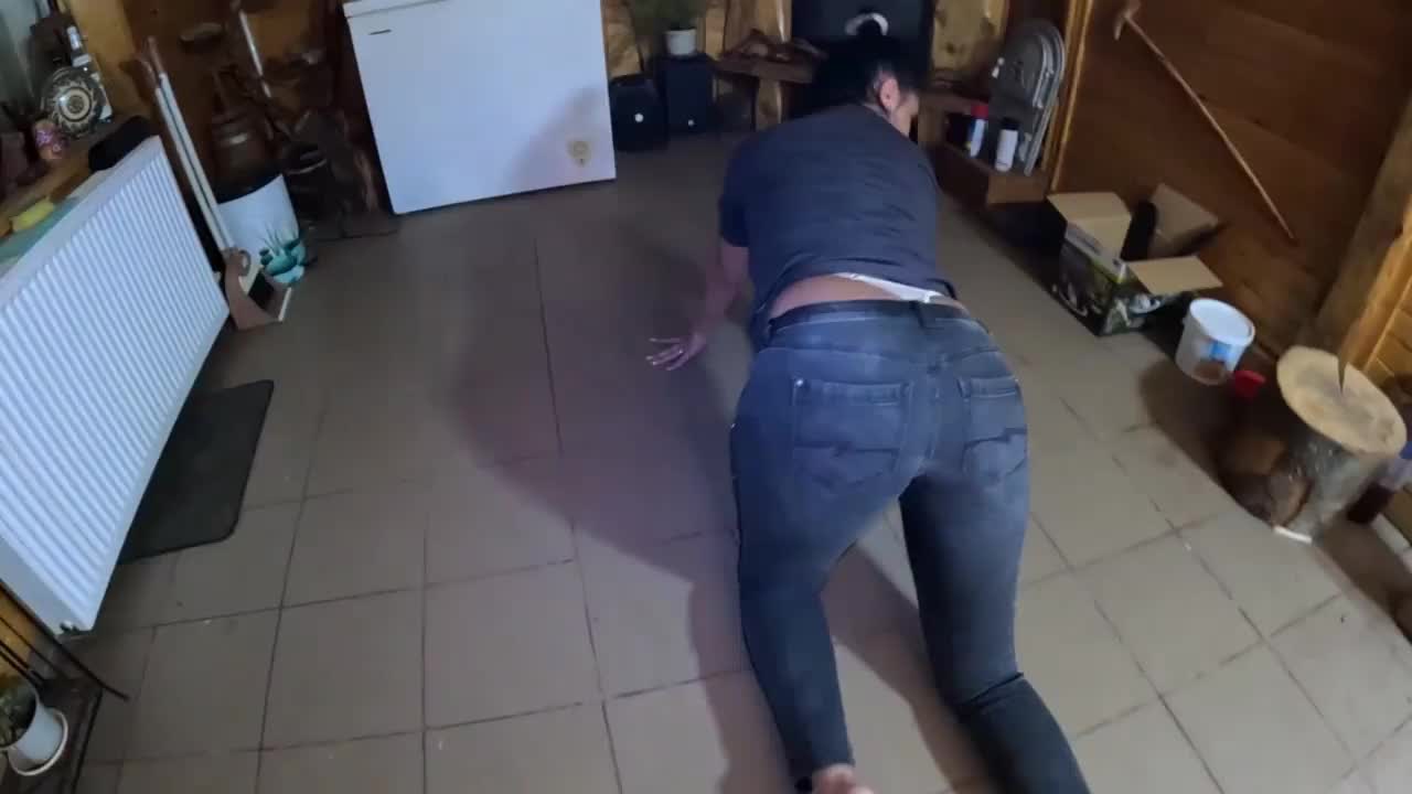 Brazilian bodybuilder dances in tight jeans at hotel, showing off muscular legs and small waist