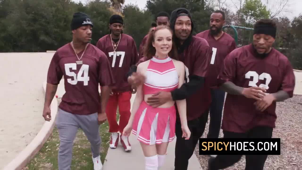 Slutty cheerleader seduces seven bbc studs for wild banging
